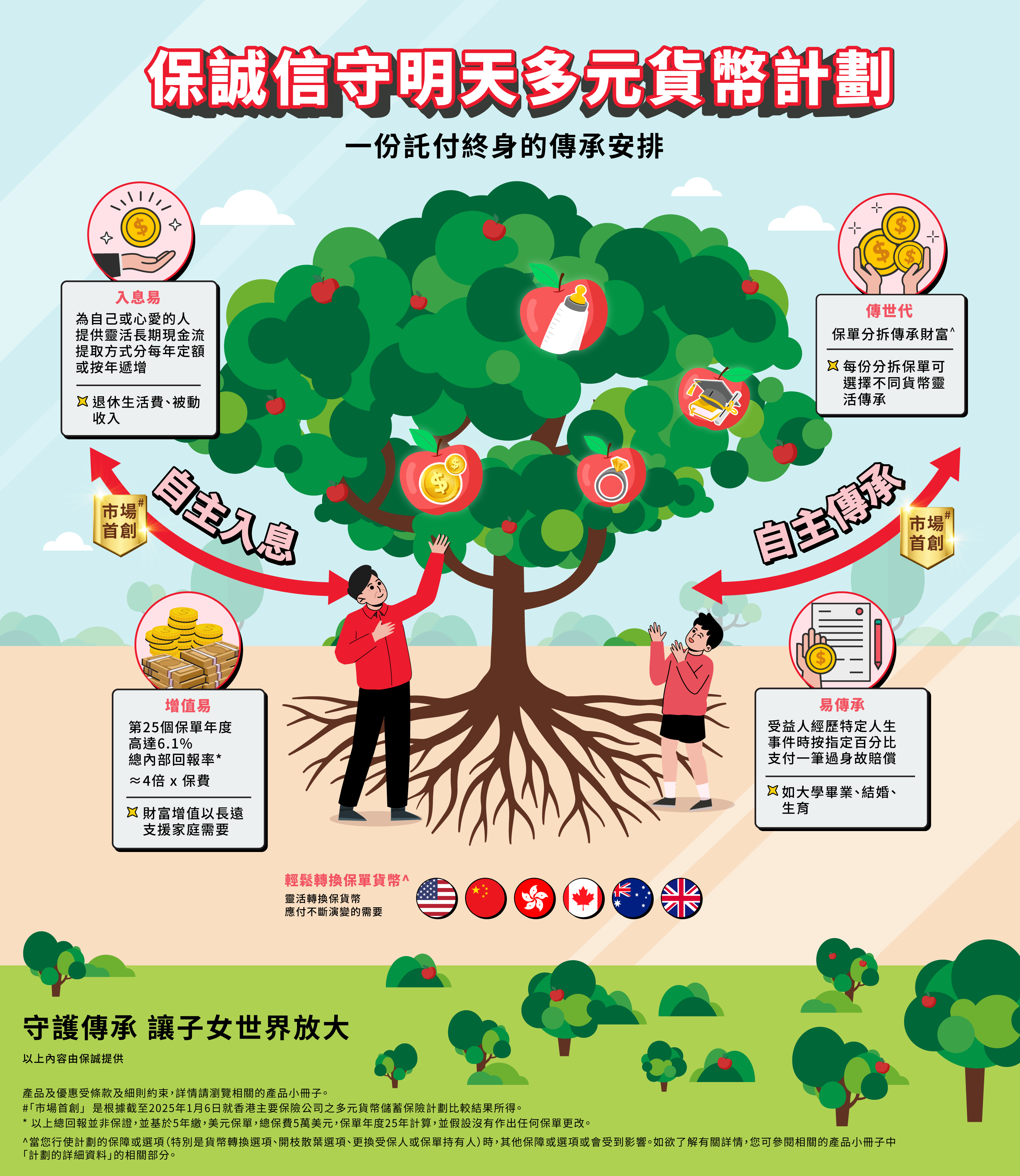 為家人創造財富不是一時三刻可以達成,所以客戶更需要及早部署。保誠信守明天多元貨幣計劃為雙重紅利結構,通過歸原紅利和終期紅利,能為客戶更好地累積財富,實現自由的理想人生。以5年繳美元保單為例,保誠信守明天多元貨幣計劃預期每年內部回報率在第25個保單年度達到6.1%,總回報近4倍總保費7,為市場最高2。